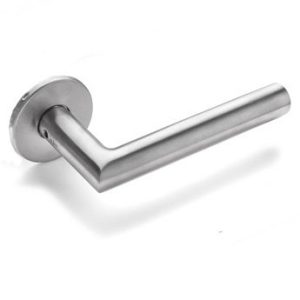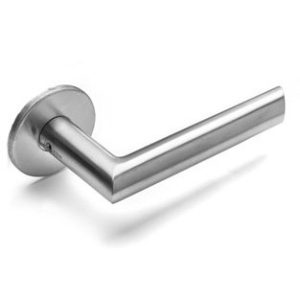 Deurkruk L-model RVS geborsteld op rond rozet 3 maten